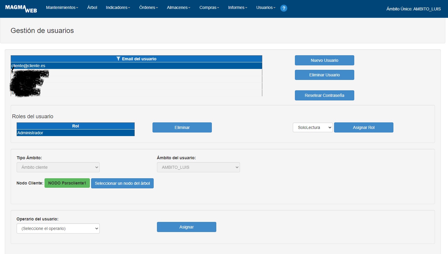 La configuración va a depender de las carcterísticas de la licencia adquirida, sin embargo en todos los casos tendrá que gestionar los usuarios mediante la pantalla que aquí vemos. Con esto les define ámbitos y roles de trabajo. Con esto estamos definiendo que puede hacer cada uno de ellos.